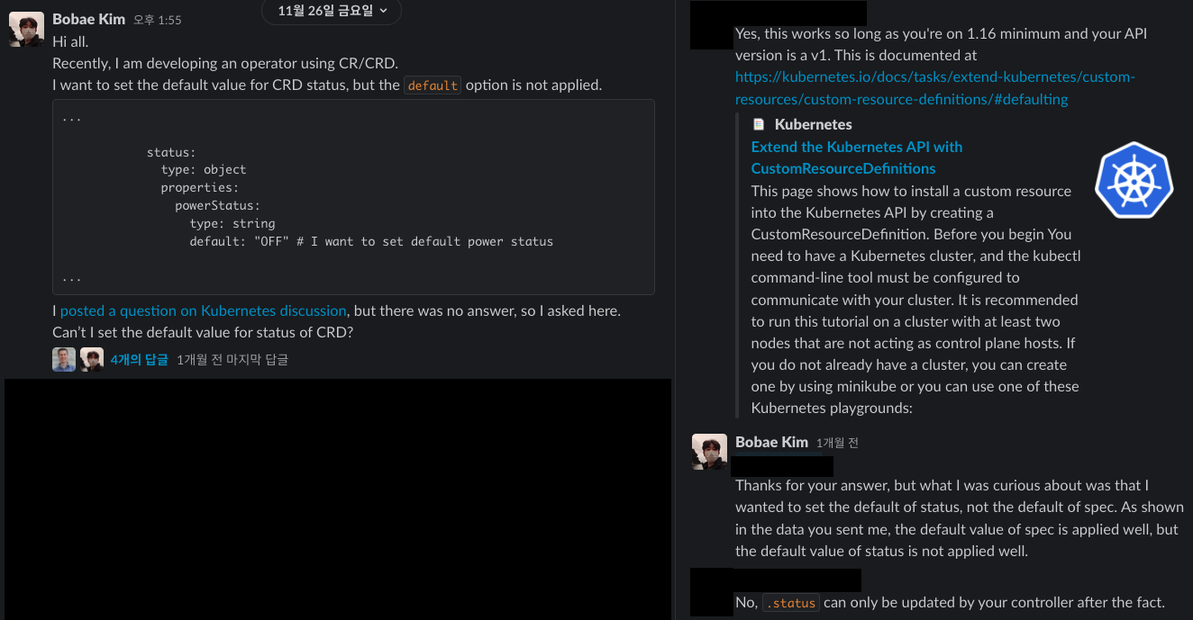 지금은 대략 어느정도 도입할 준비를 마치고 Operator, Admission controller 개발에 집중하고 있는데 k8s 환경을 이해하고 서버 개발을 진행하고 있다는 점에서 나 스스로 뿌듯하면서 재미있게 하고 있다. (그럼에도 아직도 배워야할 게 한가득이다. 위에서 말한 것은 데모 수준에서 학습한 것이기에 🥲)
