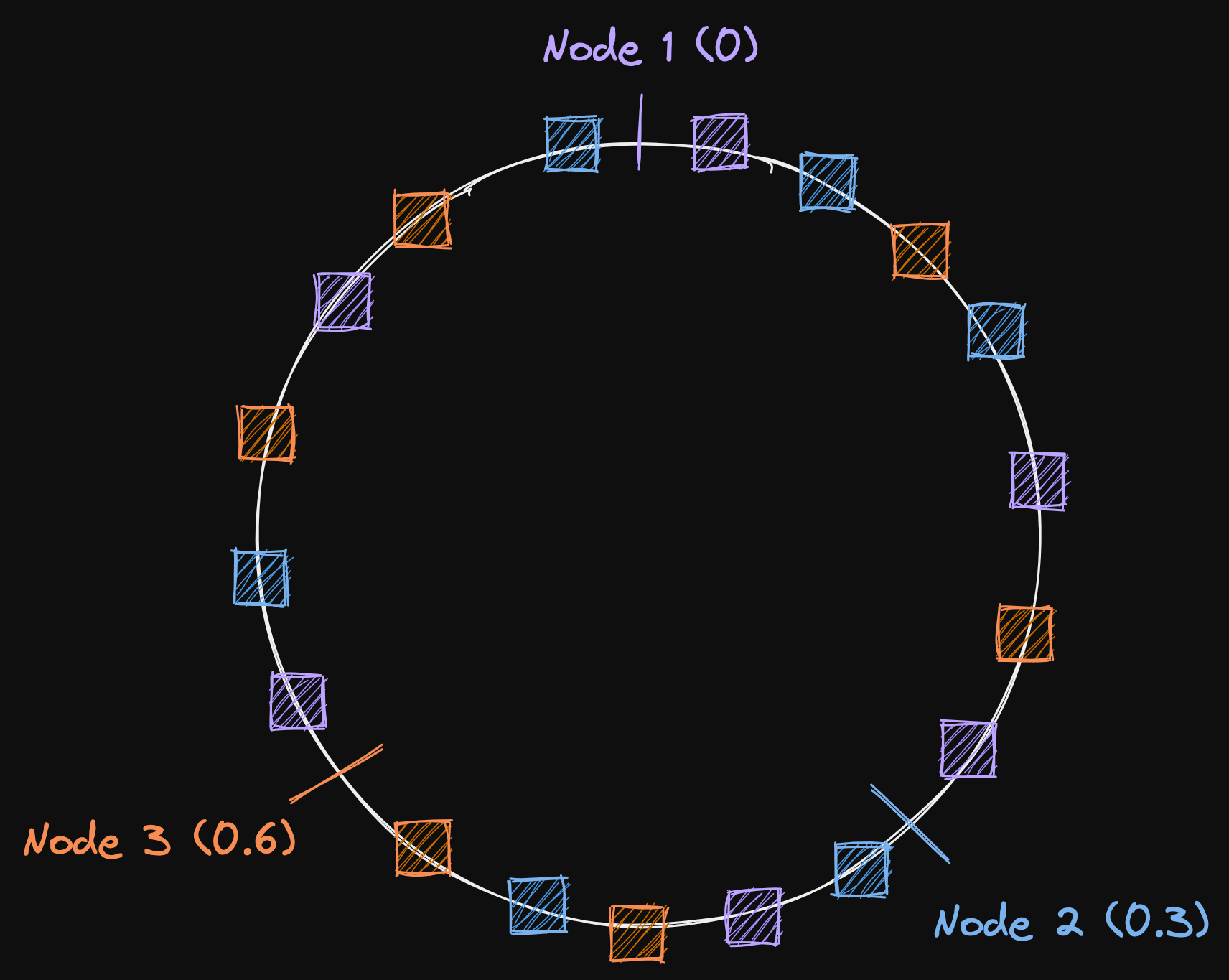 hash 함수를 통해 유한한 값의 범위로 결과가 나온다고 하자. 예를 들어 0~1 말이다. 그러면, 이 유한한 범위를 노드의 수로 나눠보자. 간단하게 하자면 Node1 (0), Node2 (0.3), Node3 (0.6)로 나눌 수 있을 것이다.
