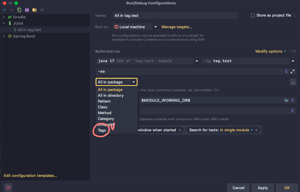 Junit test에서 스크린샷에 보이시는 것처럼 Tags 를 선택합니다.