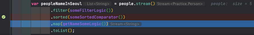 핵심은 people.stream() 인데 지금은 로직이 너무 단순하다보니 눈으로 디버깅이 된다. 어렵게 하기 위해 내부 로직을 다 메서드로 빼냈다. 그래서 결국 아래와 같다.