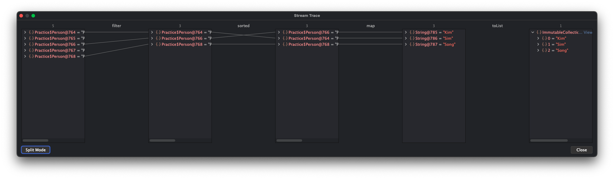 Stream 로직에 들어오는 데이터는 어떻게 되는지, 각 단계별로 데이터는 어떻게 변화했는지, 어떤 데이터들이 필터되었는지 등 각 Stream intermediate operation의 결과를 확인할 수 있다.