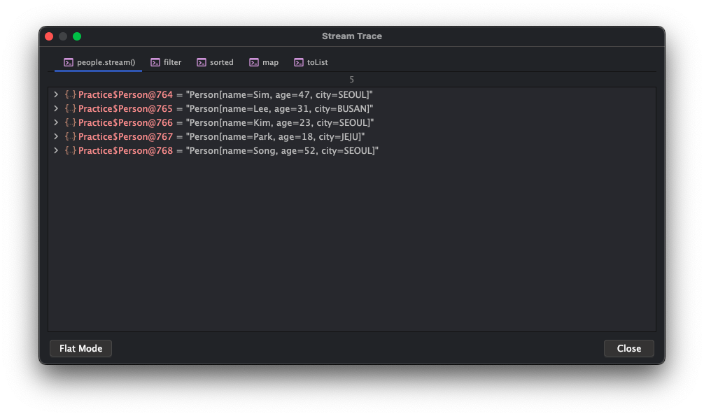각 단계 별 말고 정말 모든 Stream operation들을 한 눈에 보고 싶다면 왼쪽 아래의 Flat Mode 를 선택한다.
