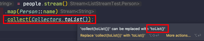 JDK17 기반에서 Stream을 사용해 List로 변환(collect)하다보면 IntelliJ에서 자주 보는 메세지가 있다.