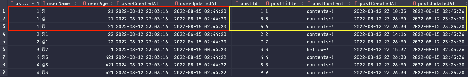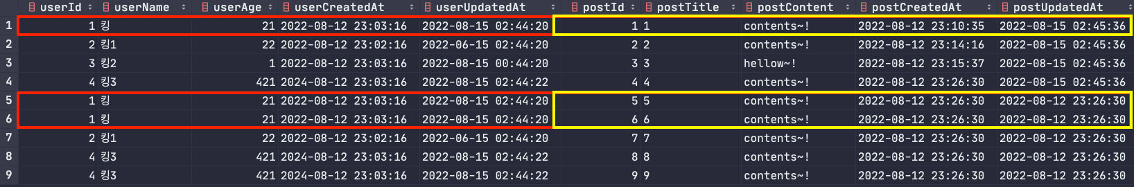 하지만 이 말은 코드 상의 객체에서 바라보는 입장이고, 사실 SQL을 통해 결과를 도출하면 중복된 값들(빨간색 박스)과 Join 된 각기 다른 값들(노란색 박스)이 존재할 것이다.
