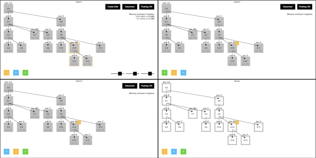 - 변화가 충돌하는 경우를 다뤄야하는 것이 가장 복잡한 부분임. Figma는 가능한 반응성 있게 느끼도록 하기 위해서 클라이언트가 변화를 만들면 서버로부터 acknowledgement(승인) 없이 바로 그 즉시 적용함. 만약 어떤 변화를 만들었는데 서버로부터 들어오는 변화가 같은 것이여서 충돌이나면 일시적으로 기존 값들을 새로운 값들이 덮어쓰는 ‘flicker’ 현상이 발생함. 우리는 이러한 ‘flicker’ 현상을 피하길 원했음.