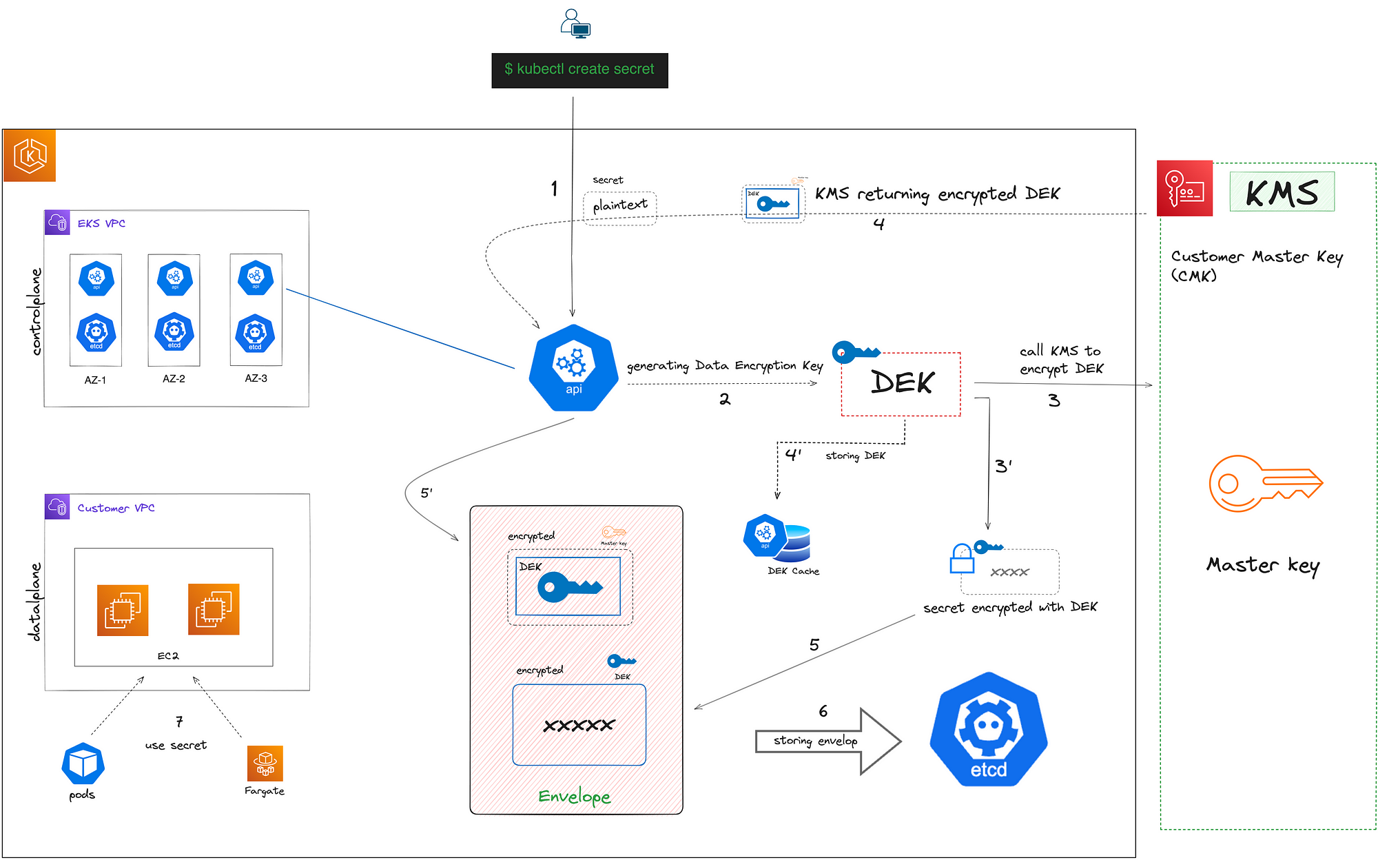 즉, KMS 등과 같은 EncryptionConfiguration을 구성하지 않으면 etcd에는 암호화되지 않은 상태로 저장된다.