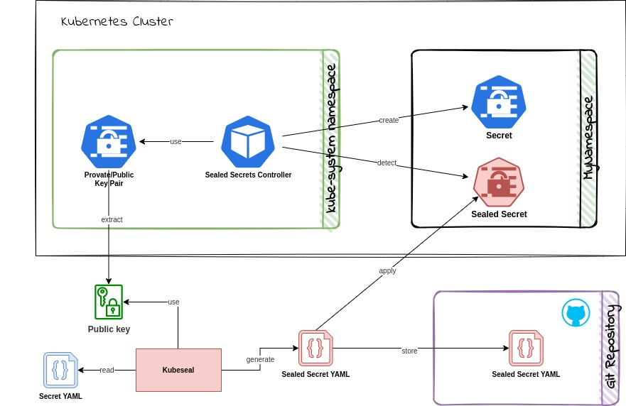 sealed-secret-controller는 Secret으로 Public/Private key를 만들어 이를 암호화/복호화하는데 이용한다. 기본적으로kube-systemns에 배포되며, 바꿀 수는 있으나kubeseal명령어 옵션을 수정하는 등 귀찮아지므로 별 다른 이유가 없다면kube-system에 배포하자.