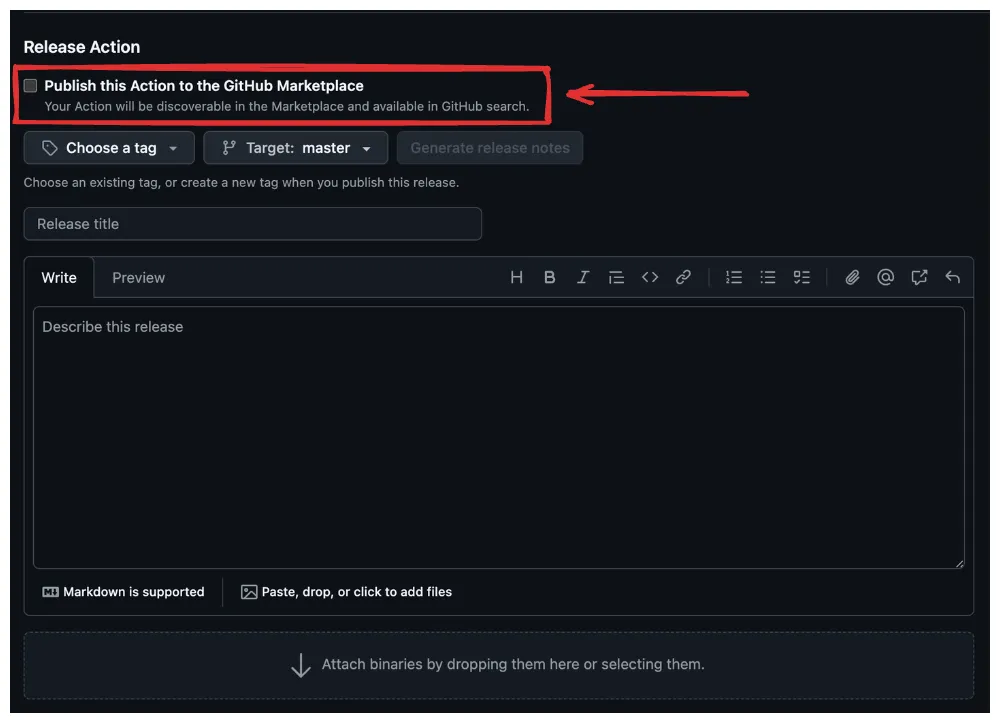 Release 섹션에 가면 아래와 같이 Github Marketplace에 배포할지 묻는 체크박스가 추가되어 있는 것을 볼 수 있어요.