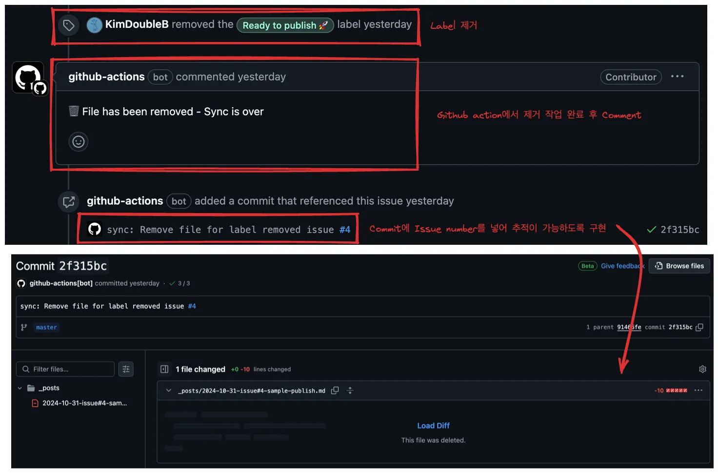 그리고 반대 케이스로 'label이 제거된 경우 파일제거', 'issue가 제거된 경우 파일 제거' 경우도 고려해서 다른 Job으로 추가했죠.
