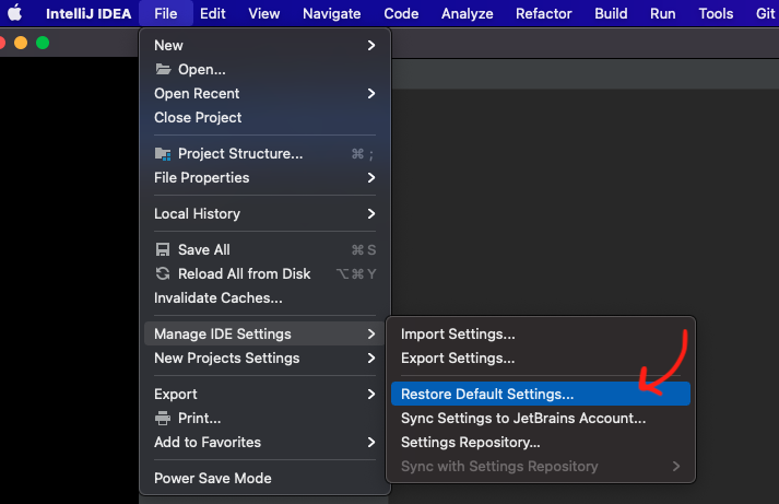 Menu: File > Manage IDE Settings > Restore default settings...