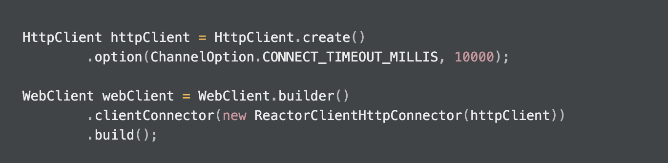 WebClient에서 Reactor Netty를 사용함에 있어, 만약 Reactor Netty의 세부 설정들을 변경하고 싶다면 clientConnector 옵션에 customize한 HttpClient 를 제공하면 된다.