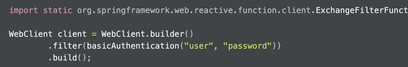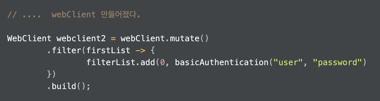 예제로 기존 존재하던 WebClient instance에 filter의 인덱스 0번에 basic authentication을 추가하고자 한다하면, 다음과 같이할 수 있다.