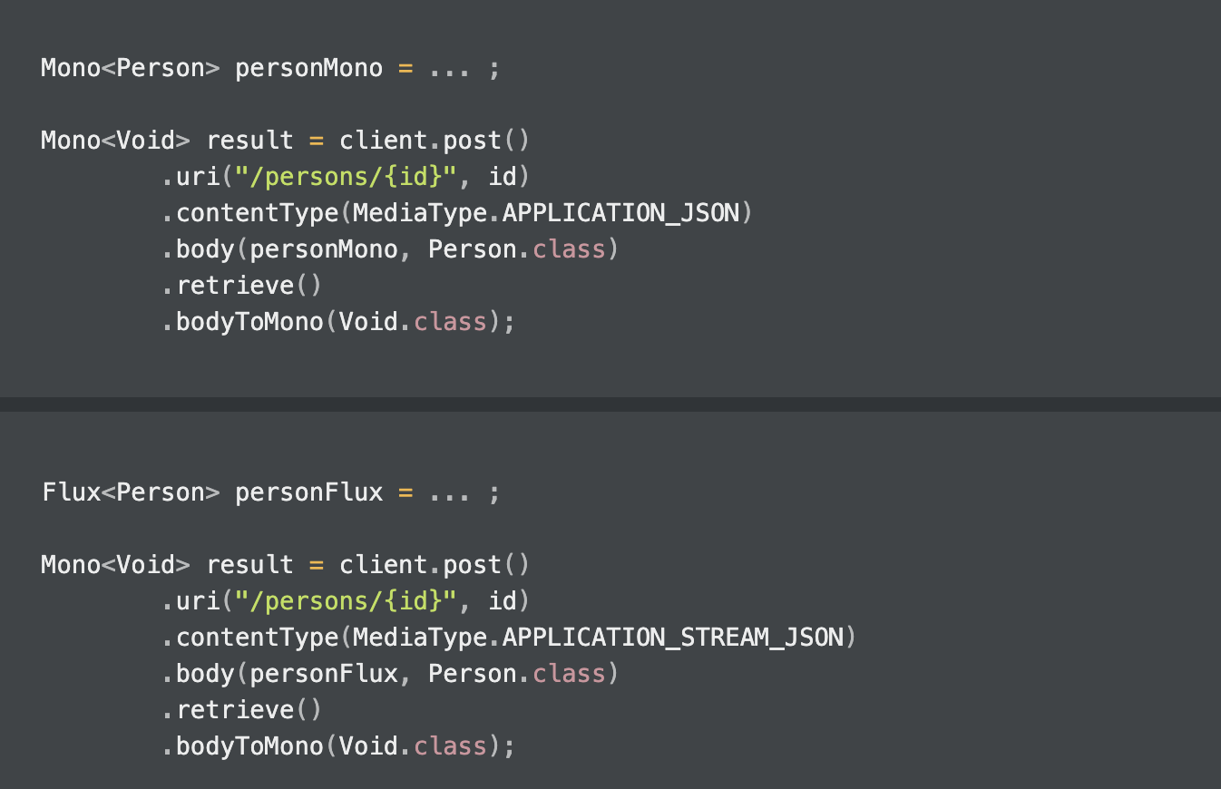 Request body는 Mono 같은 ReactiveAdapterRegistry 에 의해 핸들링되는 비동기 타입으로도 사용할 수 있다. 즉, Reactor 기반의 Mono , Flux 클래스 타입을 사용할 수 있다.