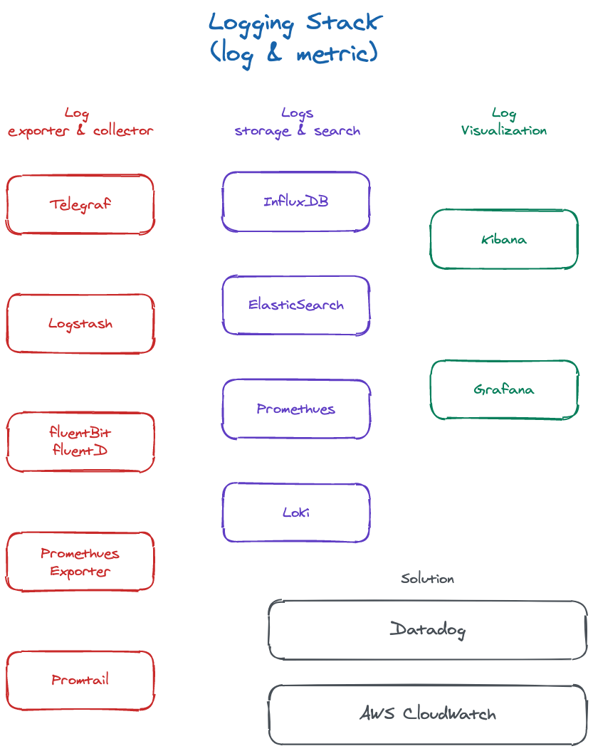 이런 Logging stack들이 기능별로 나뉘어져 있다기보단 유명한 것들끼리 묶여 사용되는 경우가 많다.