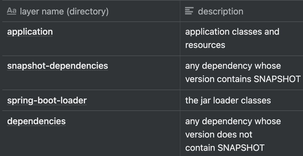 $ java -Djarmode=layertools -jar my-app.jar extract