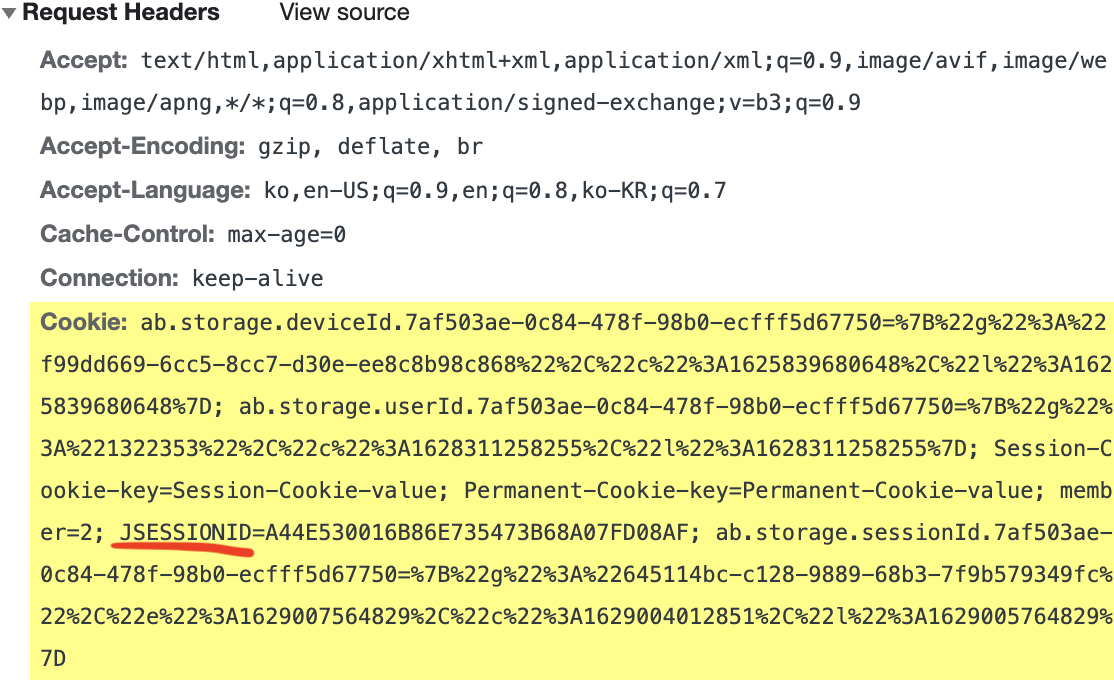 - 서버에서 클라이언트를 구분하기 위해 Session id를 부여하여 브라우저가 서버에 접속해 브라우저를 종료할 때까지 인증상태를 유지한다. → 브라우저에서 Cookie와 같이 Session id를 저장해 관리한다. Session id는 Cookie의 key로써 JSESSIONID 로 저장된다.