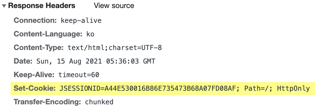 - 없으면, Cookie를 발급한다. Response header에 set-cookie key의 value로 cookie의 key-value 데이터를 설정한다.