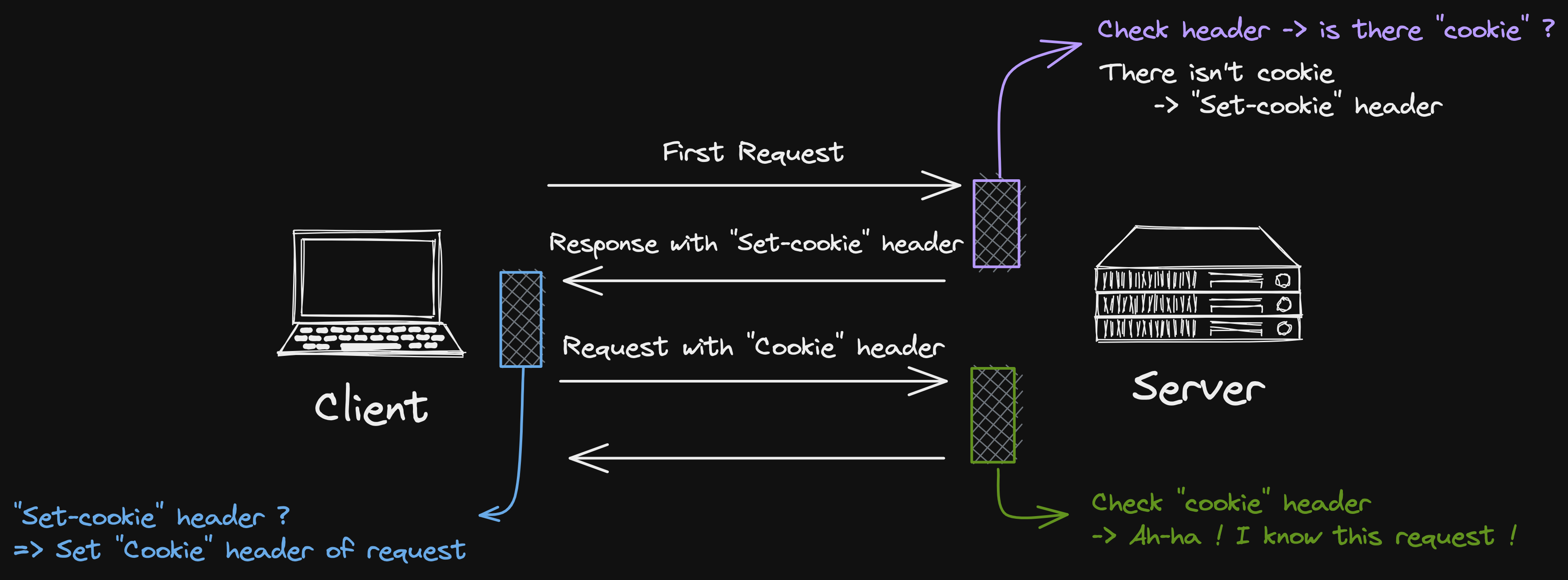 Client (browser)에서 response를 받았을 때, set-cookie 가 있으면 로컬의 쿠키 저장소에 저장한다.