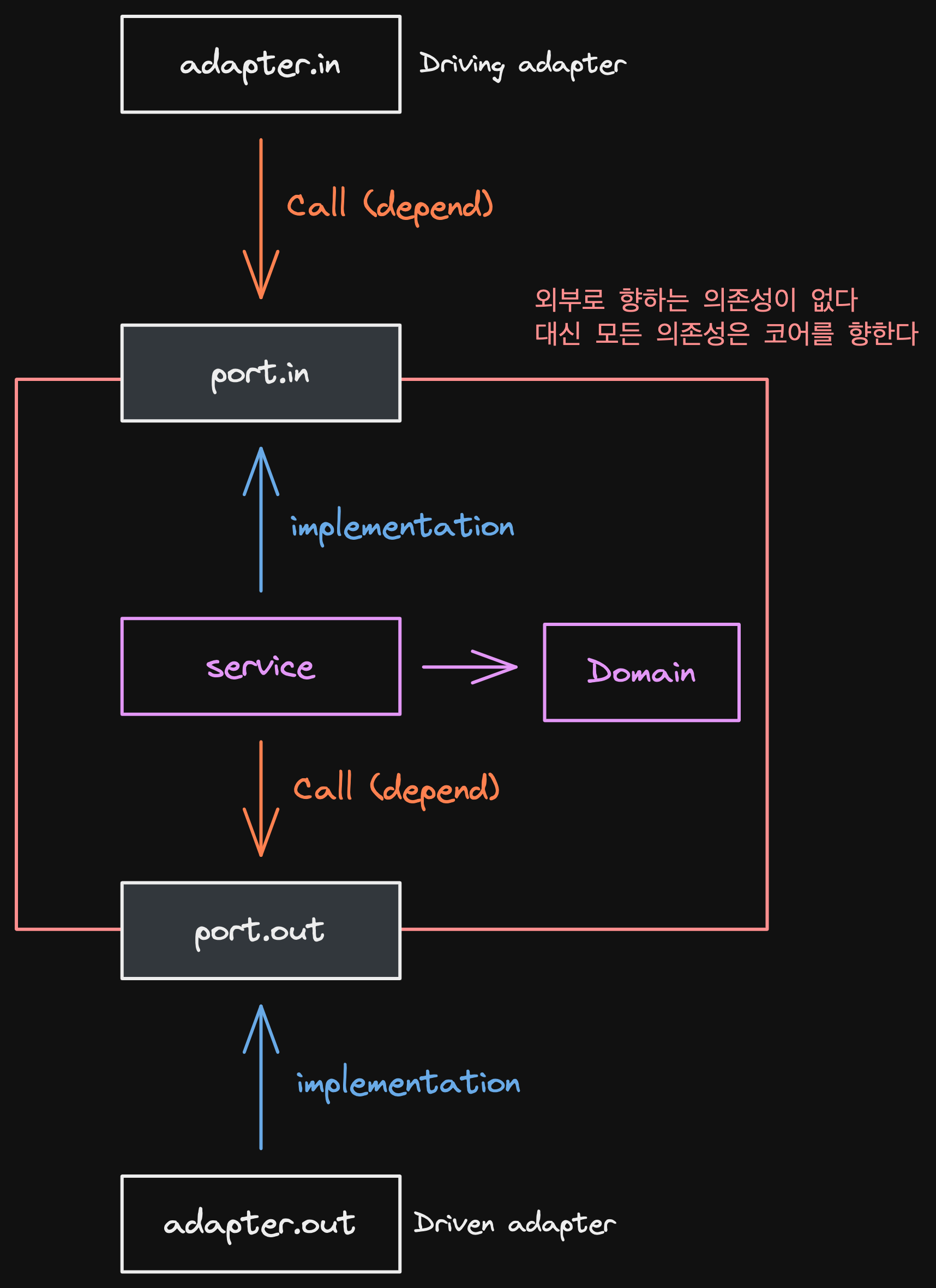 - 핵심적으로 보아야 하는 것은 코어에서 외부로 향하는 의존성이 없다는 것이다. 이는 외부 어댑터들이 목적에 맞게 포트와 잘 커뮤니케이션 되도록 구현되었다면 쉽게 교체가 가능하다는 뜻이다.